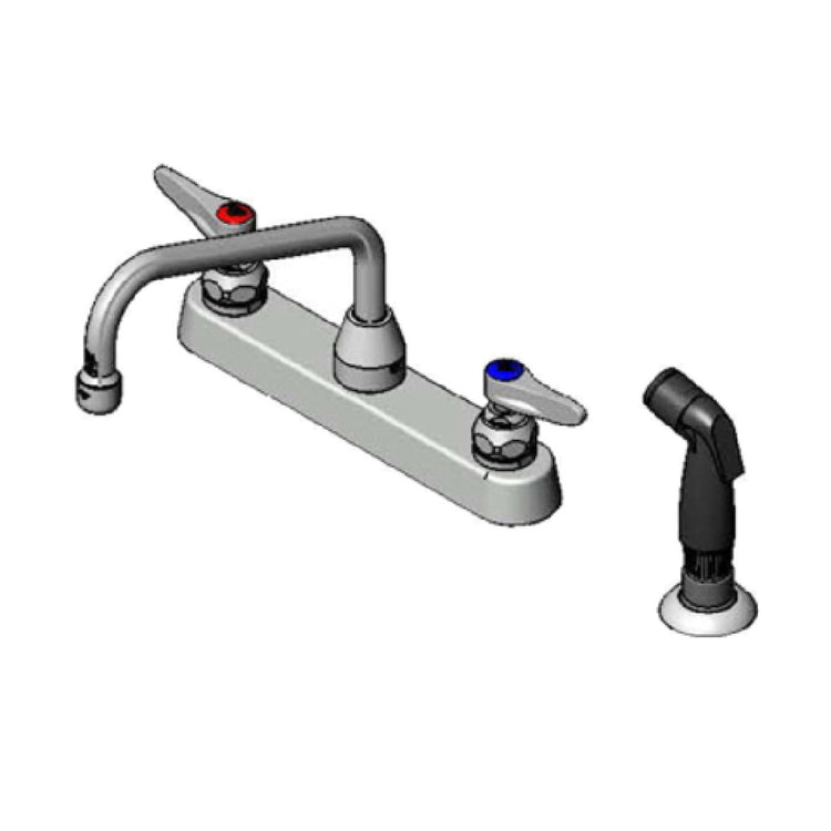 The T&S Brass B-1172-07 Faucet Workboard - deck mount 8" centers - is a highly efficient plumbing fixture designed for commercial environments that require durability and versatility. With its innovative 8" swing nozzle, this faucet provides a wide range of motion, making it suitable for various cleaning and rinsing applications. The inclusion of an 8" centers deck mount ensures a secure installation on workboards, suitable for both compact and expansive kitchen setups. The faucet features a diverter, which allows for seamless switching between the main spout and the side spray, enhancing its functionality for multitasking in busy kitchen settings. Additionally, the 7' hose connected to the side spray offers extended reach, ideal for thorough cleaning and ease of use in large sinks or preparation areas. This combination of features makes the T&S Brass B-1172-07 an essential component for hospitality and food service industries, where efficiency and reliability are paramount. Its robust construction and thoughtful design elements position it as a valuable asset for establishments looking to improve their kitchen operations with a focus on quality and functionality.