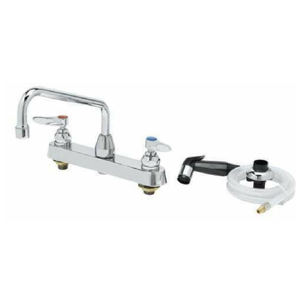The T&S Brass B-1172-CR Workboard Mixing Faucet is a high-performance, deck-mounted unit meticulously designed for professional environments requiring reliability and compliance with safety standards. Engineered with 8-inch centers, it features an 8-inch swing nozzle equipped with a 2.2 GPM aerator, ensuring efficient water flow for various applications. This model includes a sidespray with a 4-foot vinyl hose and guide, providing enhanced versatility in tasks requiring mobility and reach. The faucet is built with quarter-turn Cerama cartridges, incorporating check valves for precise control and durability. Lever handles, complete with color-coded indexes, facilitate ease of use and immediate identification. Designed for seamless integration, it comes with 1/2-inch NPT male inlets and adheres to low lead standards, making it suitable for environmentally conscious operations. The faucet's compliance with cCSAus and ADA standards underscores its commitment to safety and accessibility, making it a valuable asset in commercial kitchens, laboratories, and other professional settings. This faucet embodies robustness and versatility, positioned to meet the diverse needs of different market segments within industries that rely on dependable water delivery systems.