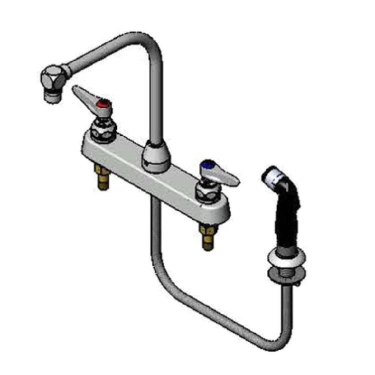 The T&S Brass B-1173 Faucet Workboard - deck mount - 8" center is a versatile plumbing fixture designed for efficiency and functionality in commercial settings. This faucet features a swing gooseneck, providing a broad range of motion, ideal for tasks requiring flexibility and reach. The integrated aerator ensures a consistent, splash-free water stream, enhancing user experience and conserving water in high-traffic environments. Additionally, the side spray function offers added convenience for rinsing and cleaning, making it a valuable tool in professional kitchens, laboratories, and other workboard applications. This faucet's deck mount design ensures easy installation on 8" center setups, catering to industry-standard workboards. The T&S Brass B-1173 is engineered for durability and reliability, crucial for demanding commercial use, and its design supports a wide array of professional environments, from food service establishments to industrial facilities. Its robust construction and thoughtful features emphasize its utility and adaptability across various market segments, underscoring its role as a dependable choice in both high-volume and specialty scenarios. By focusing on precise water delivery and user-friendly design elements, the T&S Brass B-1173 stands out as a practical solution for diverse industry needs.