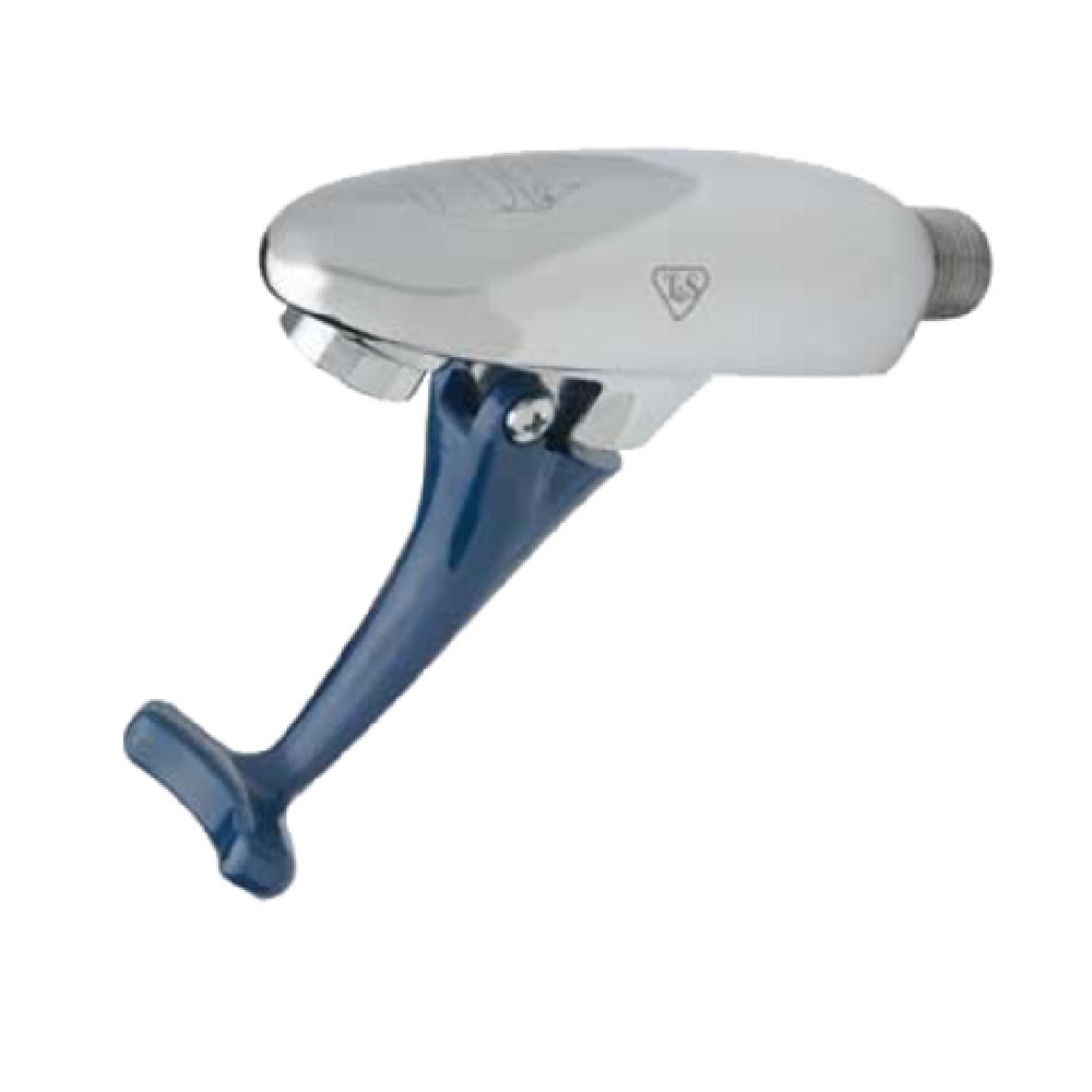 The T&S Brass B-1205-M Glass Filler Faucet is a sophisticated wall-mounted faucet specifically designed for efficient glass-filling operations. This product features a push-back mechanism, allowing for intuitive and user-friendly operation, ideal for high-traffic environments such as bars, restaurants, and cafeterias. Equipped with a volume regulator, it ensures precise control over the water flow, catering to varying demands across different segments of the food service industry. The faucet incorporates a blue lean arm, which not only provides a distinctive aesthetic but also enhances functionality by facilitating easy use. The instantaneous shut-off feature ensures quick cessation of water flow, promoting water conservation and efficiency. The unit is designed with a 3/8" IPS male inlet, making it compatible with standard plumbing connections, thus ensuring ease of installation. Each master box contains 12 units, with each master pack holding 6 units, allowing for efficient bulk purchase and inventory management for large-scale operations. The T&S Brass B-1205-M Glass Filler Faucet is an exemplary choice for establishments seeking a reliable and efficient solution for glass-filling, embodying quality and practicality in its design.