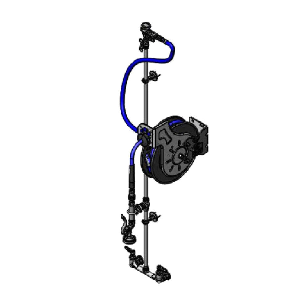 The T&S Brass B-1433-01M-QDS Hose Reel Assembly is an open, versatile system featuring a durable 3/8" x 35 ft. hose equipped with a blue spray valve. This assembly includes a robust 8" wall mount mixing faucet, engineered with quarter-turn Eterna cartridges that come with spring checks for reliable performance. The lever handles are clearly marked with color-coded indexes to ensure easy operation. To facilitate installation, the product includes EasyInstall 16" and rigid 40" risers, as well as a 36" flexible water hose connector fitted with a stainless steel quick disconnect. The assembly's ratcheting system and adjustable hose bumper enhance flexibility and control during use. It is supported by two 2-3/8" wall brackets, ensuring a secure mount. The epoxy-coated metal hose reel is built for long-lasting durability and features a 1/2" NPT connection, making it suitable for various professional settings. This comprehensive assembly is ideal for industries requiring efficient, high-performance water delivery systems, providing seamless integration into existing setups while maintaining robust functionality.