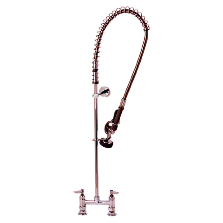 The T&S Brass B-2223 EasyInstall Pre-Rinse Unit is engineered for efficiency and reliability, making it a standout choice for commercial kitchens and food service operations. This unit features a deck mount base with a 6-inch center, ensuring compatibility with a range of installation environments. Its spring action gooseneck provides flexibility and ease of use, complemented by a 1.15 GPM spray valve (B-0107) for optimal water flow. The 24-inch riser and 44-inch flexible stainless steel hose allow for extensive reach and maneuverability, ideal for tasks requiring precise water direction. A 6-inch wall bracket supports the unit's stability, while 2-inch diameter deck flanges with 1/2-inch NPT female flanged inlets ensure secure connections. Lever handles with quarter-turn Eterna cartridges provide smooth operation and durability. This unit is compliant with low lead standards and meets the 2019 DOE PRSV - Class II requirements. The T&S Brass B-2223 is a comprehensive solution designed to enhance the efficiency of pre-rinse operations in professional kitchen settings, combining robust construction with thoughtful features to support high-demand use cases.