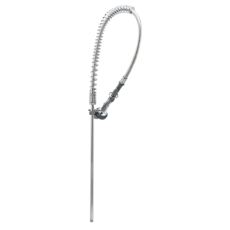The T&S Brass B-2250-B Pre-Rinse Unit Spring Action Gooseneck Without Base Faucet is an industrial-grade kitchen fixture designed for high-performance and efficiency. Standing at 38-11/16 inches high, this pre-rinse unit features a 9-1/8 inch clearance, providing ample space for large pots and pans. The 1.15 GPM spray valve (B-0107) ensures a powerful yet water-efficient cleaning process, meeting the demands of commercial kitchens. Its 44-inch flexible stainless steel hose and 24-inch riser allow for extended reach and maneuverability, accommodating various cleaning tasks with ease. A 6-inch wall bracket provides sturdy support, while the finger hook offers convenient storage when not in use. Engineered with under sink 1/4" IPS tailpieces, this unit is designed for easy installation and integration into existing setups. Compliant with low lead standards and the 2019 DOE PRSV - Class II regulations, the T&S Brass B-2250-B maintains safety and quality assurance in food service environments. Its spring action gooseneck design offers flexibility and durability, making it a reliable choice for professional kitchens ranging from restaurants to hospitality venues that prioritize efficiency and hygiene. This unit is ideal for establishments seeking robust performance combined with operational ease in their cleaning processes.