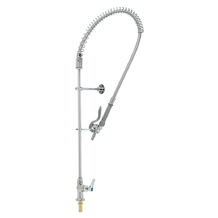 The T&S Brass B-2255-CR Pantry Filling Station is a specialized deck mount unit designed for efficient fluid transfer processes in various industrial and commercial settings. Featuring a single hole base and a single temperature system, this filling station is meticulously engineered to meet specific requirements. It includes a 6-inch wall bracket (B-0109-01) and a 24-inch riser, providing substantial reach and stability for diverse applications. The unit is equipped with a quarter-turn Cerama cartridge complemented by check valves, ensuring smooth operation and preventing backflow. The lever handle facilitates easy control, while the 44-inch stainless steel flex hose offers flexibility in use. A self-closing spray valve is incorporated to enhance efficiency and minimize waste. With a 1/2-inch NPSM inlet, the system integrates seamlessly into existing setups. The polished chrome-plated brass body not only exudes durability but also ensures compliance with low lead content standards, although it is noted as non-compliant with EPAct 2005. Certified by cCSAus, the T&S Brass B-2255-CR is a reliable choice for those seeking a robust and effective filling station, tailored to meet the needs of various markets within the industry, from food service to laboratory settings.
