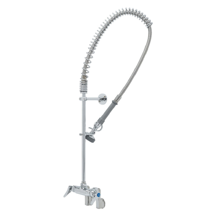 The T-S Brass B-2261-B EasyInstall Pre-Rinse Unit is engineered for versatility and efficiency, making it an essential component in commercial kitchens and food service establishments. This wall-mounted unit features adjustable inlet arms ranging from 2-1/4" to 8-1/4" centers, allowing for adaptable installation to various plumbing configurations. It includes a spring action gooseneck and a 1.15 GPM spray valve (B-0107), optimizing water usage without compromising performance. The unit is equipped with an 18" riser and a 44" flexible stainless steel hose, providing extensive reach and maneuverability for thorough cleaning tasks. A 6" wall bracket ensures stable mounting, while 1/2" IPS female inlets facilitate straightforward connection to water supply lines. The lever handles are designed for ease of use, and the quarter-turn Eterna cartridges with spring checks provide reliable sealing and prevention of backflow. Complying with low lead requirements, the T-S Brass B-2261-B also meets the 2019 DOE PRSV - Class II standards, ensuring energy efficiency and regulatory compliance. This pre-rinse unit combines robust features and regulatory adherence, making it a valuable asset for kitchens aiming for efficiency and adaptability in their cleaning processes.