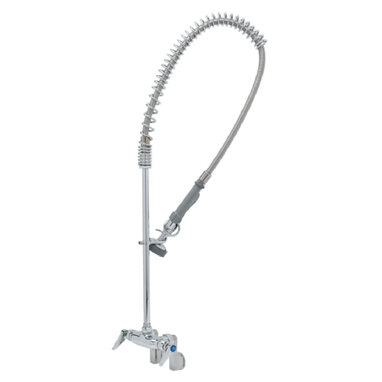 The T&S Brass B-2261 EasyInstall Pre-Rinse Unit is a versatile solution designed to enhance the efficiency of commercial kitchens. Engineered for wall mounting, it features adjustable inlet arms that accommodate center measurements ranging from 2-1/4" to 8-1/4", ensuring adaptability in various installation settings. The unit includes a spring action gooseneck and is equipped with a 1.15 GPM spray valve (B-0107), which offers optimal water flow for pre-rinsing tasks. An 18" riser supports the structure, while the 44" flexible stainless steel hose provides extensive reach and maneuverability. The unit connects via 1/2" IPS female inlets, enhancing compatibility with standard plumbing systems. Lever handles ensure ease of use, complemented by quarter-turn Eterna cartridges with spring checks, which promote durability and prevent backflow. Certified low lead, the T&S Brass B-2261 complies with 2019 DOE PRSV - Class II standards, underscoring its commitment to safety and environmental considerations. This unit is ideal for restaurant owners, catering businesses, and food service professionals seeking a reliable and adaptable pre-rinse solution that meets rigorous industry standards, ensuring high performance and compliance in food preparation environments.