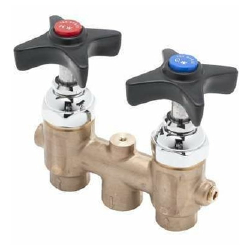 The T&S Brass B-2266 Mixing Faucet is a concealed deck mount fixture designed with precision for efficient utility in various industry segments. Featuring 3-inch centers, this faucet integrates Eterna cartridges known for their durability and reliable performance. It is equipped with black polypropylene 4-arm handles, which ensure a comfortable grip and ease of use. The absence of an escutcheon provides a minimalist and clean aesthetic, ideal for modern applications. This model includes 3/8" NPT male inlets and outlets, facilitating seamless installation and compatibility with existing plumbing systems. As a low lead compliant product, it aligns with stringent safety and environmental standards. Certified by NSF and cCSAus, it meets high public health criteria and is ADA Compliant, ensuring accessibility for all users. This mixing faucet is particularly suitable for commercial kitchens, healthcare facilities, and other professional environments where robust and reliable plumbing fixtures are essential. Its thoughtful design and adherence to industry standards underscore its practicality and commitment to quality, making it a valuable component in various professional settings.