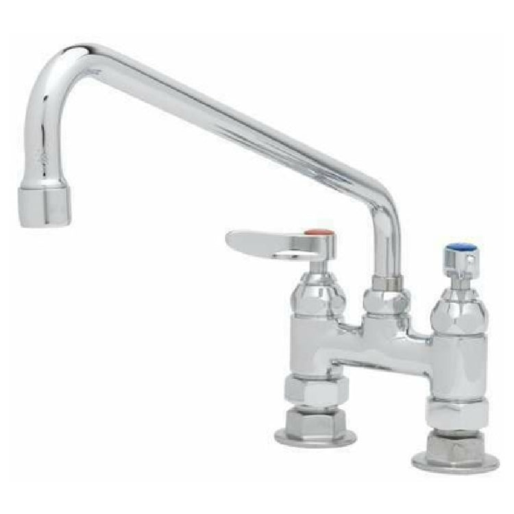 The T-S Brass B-2283-065X Double Pantry Faucet is a robust and versatile fixture designed for commercial and industrial applications. As a deck mount faucet with 4" centers, it offers a stable and reliable solution for various environments. Featuring an 18" swing nozzle equipped with a stream regulator, this faucet ensures precise water flow control, making it ideal for kitchens and workspaces requiring exacting standards. The faucet includes a lock washer to convert the nozzle to a rigid setup, providing flexibility to suit user preferences or specific installation needs. Lever handles with color-coded indexes facilitate easy operation, ensuring compliance with ADA standards for accessibility. The integration of quarter-turn Eterna cartridges with spring checks enhances the durability and longevity of the faucet, making it a low-maintenance choice for busy settings. With 1/2" NPT female inlets, the faucet accommodates standard plumbing connections. Additionally, its low lead construction meets rigorous safety standards, as verified by cCSAus certification. The T-S Brass B-2283-065X Double Pantry Faucet is engineered to deliver exceptional performance and reliability, catering to the demands of diverse market segments within the industry.