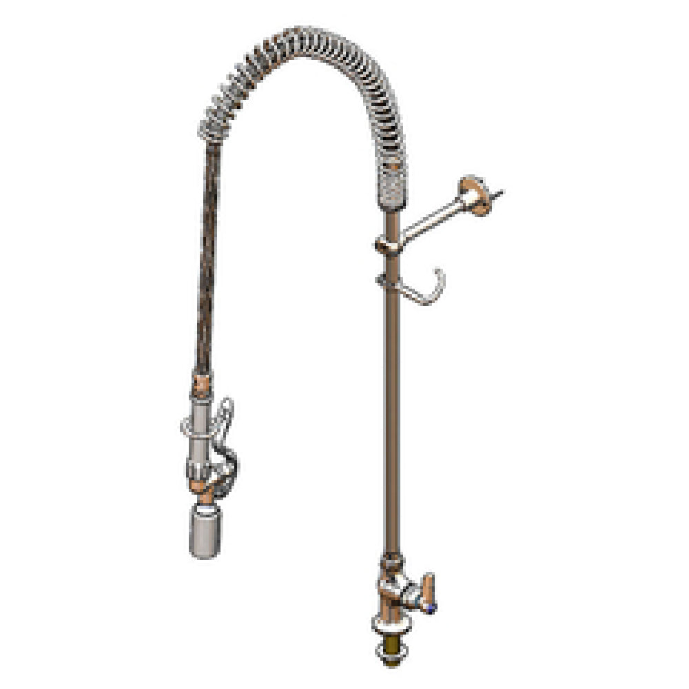 The T&S Brass B-2285-BC Pre-Rinse Unit Deck Mount Single Hole Base is a highly specialized piece of equipment designed for rigorous industrial and commercial kitchen environments. This unit is engineered with a single temperature control, allowing for precise water temperature management, which is essential for efficient cleaning tasks. It features a spring action gooseneck and a low flow 0.65 GPM spray valve (B-0107-C), ensuring water conservation while maintaining effective cleaning performance. The unit is built with a 24-inch riser and a 44-inch flexible stainless steel hose, offering extensive reach and flexibility for various kitchen setups, complemented by a 6-inch wall bracket for stable mounting. With a 1/2-inch NPSM male inlet, it is designed for straightforward installation. The lever handle is equipped with a quarter-turn Eterna cartridge, known for its durability and ease of use. This model adheres to low lead standards and meets the 2019 DOE PRSV - Class II requirements, demonstrating its compliance with safety and environmental regulations. The T&S Brass B-2285-BC is ideal for restaurants, hotels, and food service establishments seeking a reliable and efficient pre-rinse solution that prioritizes water efficiency and robust design.