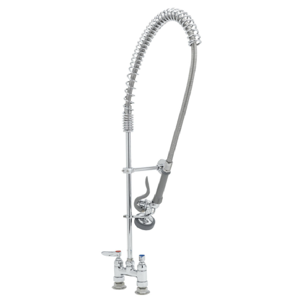 The T&S Brass B-2288 EasyInstall Pre-Rinse Unit Deck Mount Base 4" Center is a versatile and efficient fixture designed for a variety of commercial kitchen environments. It features a spring-action gooseneck, which enhances maneuverability and ease of use, paired with a 1.15 GPM spray valve (B-0107) for efficient water usage. The unit is equipped with a 24" riser and a 44" flexible stainless steel hose, providing ample reach and flexibility for thorough cleaning tasks. Its 6" wall bracket ensures stability and support during operation. The pre-rinse unit is designed with 1/2" NPT female inlets for secure and straightforward installation. Lever handles and quarter-turn Eterna cartridges deliver reliable performance and longevity. This product adheres to low lead standards and complies with the 2019 DOE PRSV - Class II requirements, underscoring its commitment to safety and industry regulations. The T&S Brass B-2288 is ideal for food service operations requiring a robust and adaptable pre-rinse solution, offering both durability and compliance in demanding environments.
