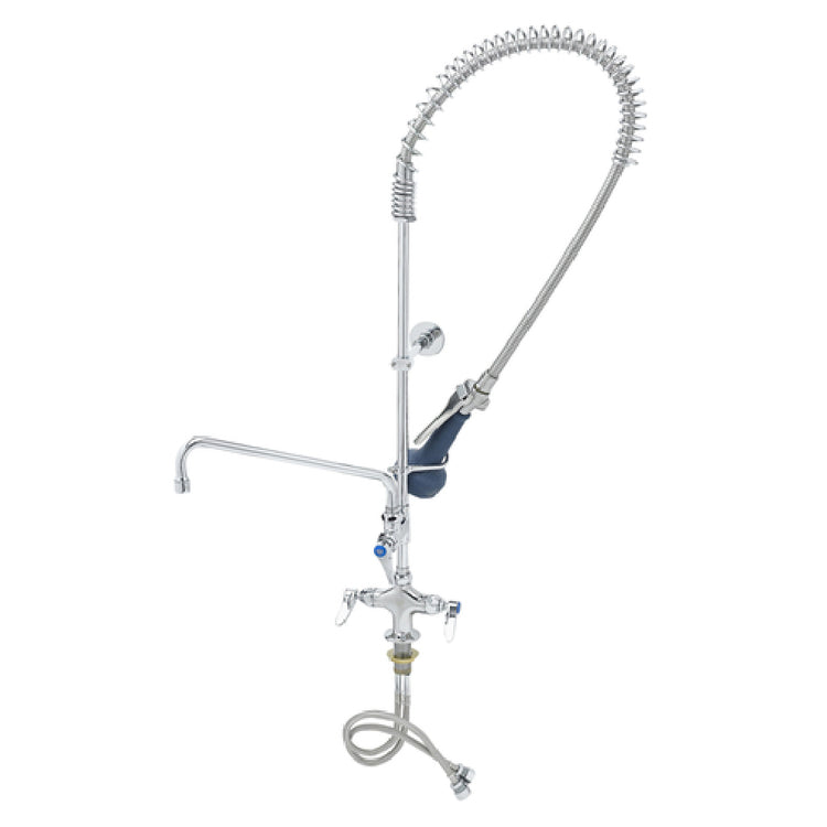 The T&S Brass B-2338-08C Pre-Rinse Unit Deck Mount Single Hole Mixing Faucet is an advanced fixture designed to cater to the diverse needs of commercial kitchens and food service establishments. This unit features a deck mount configuration, suitable for single hole installations, and incorporates a spring action gooseneck, enhancing its flexibility and ease of use. The faucet is equipped with a low flow 0.65 GPM spray valve (B-0108-C), making it an efficient choice for water conservation. Additionally, it includes a 12-inch swing spout add-on faucet and an 18-inch riser, offering versatility in application. The unit comes with a 44-inch flexible stainless steel hose, providing extensive reach and maneuverability for various cleaning tasks. A 6-inch wall bracket ensures stability and secure mounting. Designed with 1/2-inch NPSM male inlets, lever handles, and quarter-turn Eterna cartridges, the faucet offers seamless operation and durability. It also maintains compliance with low lead standards and meets the 2019 DOE PRSV - Class II requirements. The T&S Brass B-2338-08C is a reliable and efficient pre-rinse unit, suitable for enhancing the functionality and performance in busy kitchen environments across different market segments.