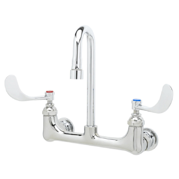 The T&S Brass B-2443-F1-CR-SC Faucet-Wall Mount-8" Centers is a highly reliable and efficient fixture designed for diverse applications in the plumbing industry. This wall-mounted faucet is engineered with 8-inch centers, making it a suitable choice for commercial and industrial environments requiring precise installation specifications. The faucet features a sturdy rigid gooseneck spout, which provides a consistent water flow, further enhanced by a 1.0 gpm aerator that ensures both water efficiency and performance. Equipped with 4-inch handles, it offers ease of use, meeting the accessibility standards set by ADA compliance. The inclusion of quarter-turn Cerama cartridges allows for smooth operation and durability, reducing maintenance needs over time. Additionally, this faucet is crafted with low lead materials, adhering to strict health and safety regulations. The T&S Brass B-2443-F1-CR-SC Faucet is a perfect fit for settings such as commercial kitchens, laboratories, and healthcare facilities, where robust performance and compliance with industry standards are paramount. Its combination of advanced features and compliance certifications makes it an invaluable asset for professionals seeking high-quality plumbing solutions tailored to specialized requirements.