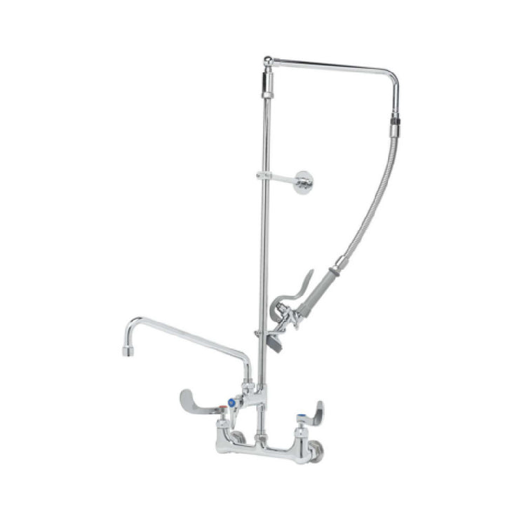 T&S Brass, B-2466, Wall Mount Mixing Faucet, 8" with polished chrome plated brass body, add-on faucet with ceramic cartridge and lever handle, 12" swing nozzle with stream regulator outlet, 26" riser, overhead swivel arm, 20" flexible stainless steel hose with heat resistant handle, 1.15 GPM spray valve, ceramic cartridges with check valves, 4" wrist action handles, 1/2" NPT female inlets, 6" adjustable wall brackets and spray valve holder. Certified to ASME A112.18.1/CSA B125.1, NSF 61-Section 9 & NSF 372. 2019 DOE PRSV - Class II compliant.