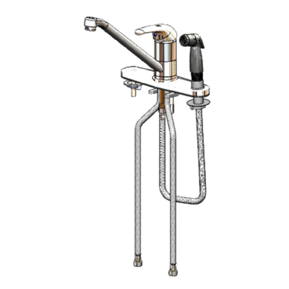 The T&S Brass B-2730-3H Faucet is a single lever deck mount that is specifically designed for efficiency and compliance in various industrial settings. This faucet features 8-inch centers with a 3-hole configuration, providing a robust and secure installation. Its rigid base ensures stability and durability, while the ceramic cartridge enhances performance by providing a smooth and reliable operation. Complementing its functionality is a 48-inch side spray, which offers added flexibility for diverse applications. Additionally, it is equipped with a 16-inch stainless steel flex hose, ensuring longevity and resistance to wear. The 2.2 GPM aerator optimizes water flow, balancing performance with conservation. Notably, this faucet is low lead compliant, adhering to stringent safety standards, and has an outer diameter of 3/8 inches. Furthermore, it meets ADA compliance, making it accessible for all users, and is NSF certified, attesting to its quality and safety in food service environments. The T&S Brass B-2730-3H Faucet is an excellent choice for various segments within the industry, including commercial kitchens and public facilities, where durability, performance, and compliance are paramount.