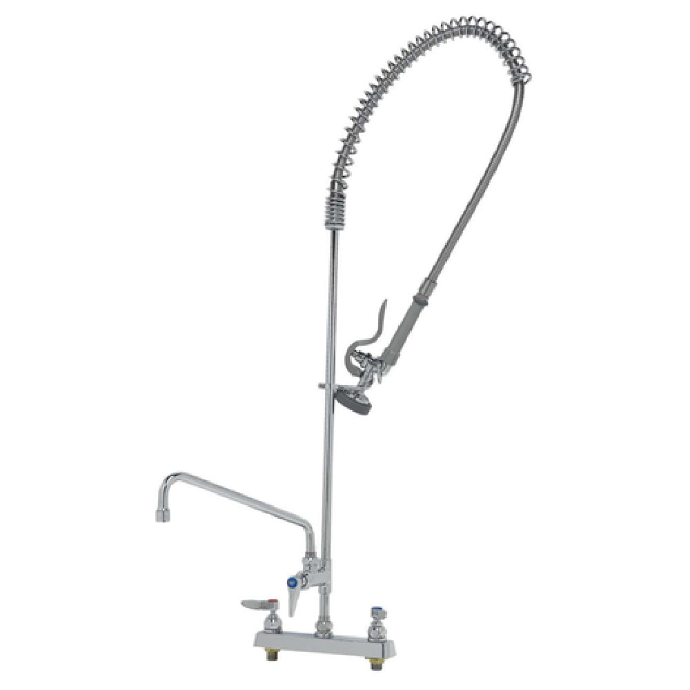 The T&S Brass B-5120-12-B EasyInstall Workboard Pre-Rinse Unit Deck Mount Mixing Faucet is a comprehensive solution designed for efficiency and durability in commercial kitchen environments. It features an ergonomic deck mount mixing faucet with an add-on faucet equipped with a 12-inch swing nozzle, providing versatility in usage. The unit boasts an 8-inch center and a spring action gooseneck, enhancing the flexibility of water delivery. It is fitted with a 1.15 GPM spray valve (model B-0107) which ensures effective pre-rinsing, supported by a 24-inch riser and a 44-inch flexible stainless steel hose for extended reach. The 6-inch wall bracket ensures stability and secure installation, while the 1/2-inch NPT male inlet facilitates easy connection. Lever handles and quarter-turn Eterna cartridges ensure smooth operation and durability, contributing to a low-lead design that meets the 2019 DOE PRSV - Class II standards. This unit serves as a valuable asset for various market segments within the food service industry, offering reliable performance with its robust construction and thoughtful design, ensuring both function and compliance with health standards.