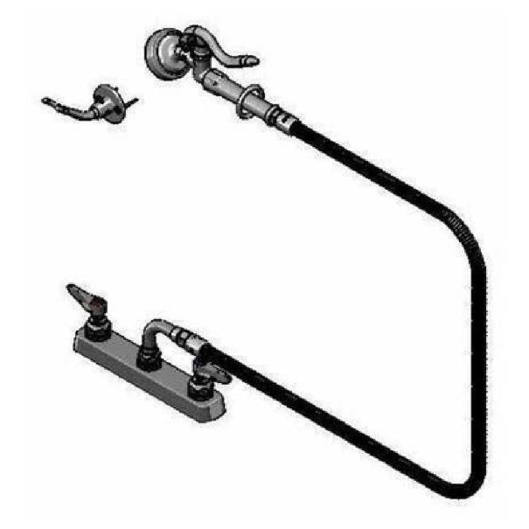 The T&S Brass B-5120-34A68H35 Workboard Mixing Faucet is a highly efficient and durable solution designed for professional settings requiring precision and reliability. This deck-mounted faucet features 8-inch centers, ensuring compatibility with a wide range of commercial workboards. It comes equipped with a 1.15 GPM angled spray valve (B-0107-035), delivering optimal water flow for various cleaning tasks. The 68-inch flexible stainless steel hose offers extensive reach and flexibility, while the quarter-turn Eterna cartridges with spring checks provide smooth operation and prevent backflow, enhancing the faucet's longevity and functionality. The lever handles are designed with color-coded indexes for easy operation and identification, accommodating the needs of busy environments. A hose hanger hook adds convenience for storage and accessibility. The faucet is equipped with 1/2-inch NPT male inlets, adhering to industry standards for installation. Compliant with low lead regulations, it also meets the 2019 DOE PRSV - Class II standards, making it a responsible choice for environmentally conscious businesses. This workboard mixing faucet is an ideal choice for various professional markets, including food service and hospitality, where dependable performance and compliance with safety standards are paramount.