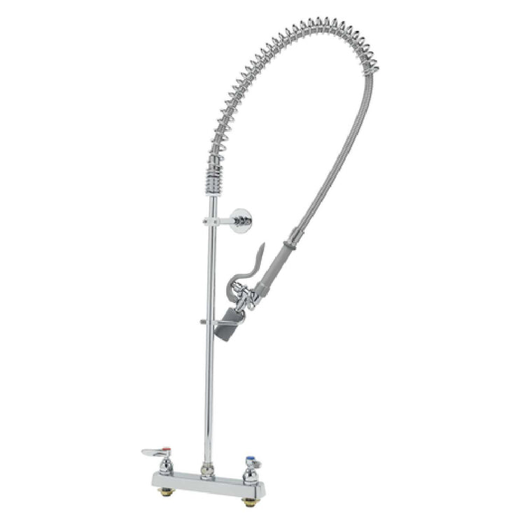 The T&S Brass B-5120-BJ EasyInstall Workboard Pre-Rinse Unit Deck Mount Mixing Faucet is designed to provide unparalleled convenience and efficiency for food service establishments and industrial kitchens. This unit features an 8-inch center deck mount, ensuring compatibility with a wide range of sinks and countertops. The spring action gooseneck allows for flexible maneuvering, enhancing its practicality in rigorous environments. Equipped with a 1.07 GPM spray valve (B-0107-J), this pre-rinse unit delivers a reliable and efficient water flow suitable for various cleaning tasks. The 24-inch riser and 44-inch flexible stainless steel hose further extend the reach, making it ideal for large-scale operations. A 6-inch wall bracket ensures stability and support, enhancing the durability of this unit. The faucet is fitted with quarter-turn Eterna cartridges and lever handles, offering precise control and ease of use. Featuring low lead compliance, this unit aligns with industry safety standards and the 2019 DOE PRSV-Class II regulation. The ½-inch NPT male inlets facilitate a secure and straightforward installation process. Tailored for commercial kitchen environments, the T&S Brass B-5120-BJ offers exceptional value with its robust design and state-of-the-art functionality aimed at optimizing pre-rinse operations.