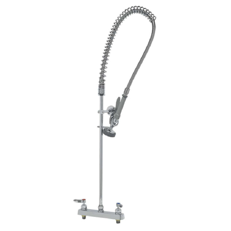 The T&S Brass B-5120-CR-B EasyInstall Workboard Pre-Rinse Unit Deck Mount Mixing Faucet is a highly functional and durable solution designed for various commercial kitchens and food service environments. This unit features an 8-inch center deck mount, providing a stable base for demanding tasks. The spring action gooseneck enhances maneuverability, paired with a 1.15 GPM spray valve (B-0107) that ensures efficient water use and effective cleaning. A 24-inch riser elevates the faucet, facilitating ease of use with larger items, while the 44-inch flexible stainless steel hose offers maximum reach and flexibility. The 6-inch wall bracket ensures additional support, maintaining the unit's stability during operation. Equipped with quarter-turn Cerama cartridges, the faucet allows for smooth operation and long-lasting performance. Lever handles provide user-friendly control, and the 1/2-inch NPT male inlet simplifies installation. The faucet's construction adheres to low lead standards, aligning with the 2019 DOE PRSV - Class II specifications for safety and compliance. This robust combination of features makes the T&S Brass B-5120-CR-B a valuable asset for different segment markets within the food service industry, offering reliability and efficiency tailored to high-volume, professional kitchen environments.