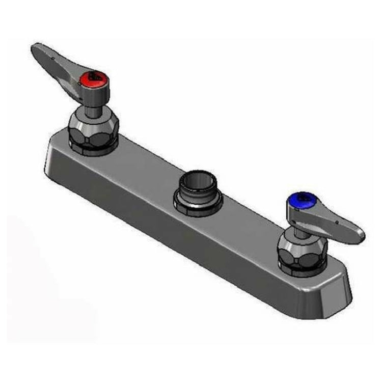 The T&S Brass B-5120-CR-LN Workboard Mixing Faucet is a deck-mounted fixture engineered for precision and durability, featuring 8-inch centers for easy installation in a variety of spaces. This faucet is designed without a nozzle, allowing users to customize it according to specific needs. Integral to its function are the quarter-turn Cerama cartridges, complete with check valves that ensure a smooth and reliable water flow, reducing the risk of backflow. The lever handles, color-coded for intuitive operation, are an accessible feature that enhances the user experience, complying with ADA standards for improved accessibility. The faucet includes 1/2-inch NPT male inlets, facilitating straightforward connectivity in plumbing installations. With a low lead composition, it adheres to stringent safety regulations, making it a suitable choice for environments where water quality and safety are paramount. This mixing faucet is ideally suited for commercial kitchens, laboratories, and other professional settings that demand robust and reliable fixtures. Its thoughtful design and compliance with key industry standards underline its unique value proposition, catering to a diverse range of market segments seeking high-performance plumbing solutions.