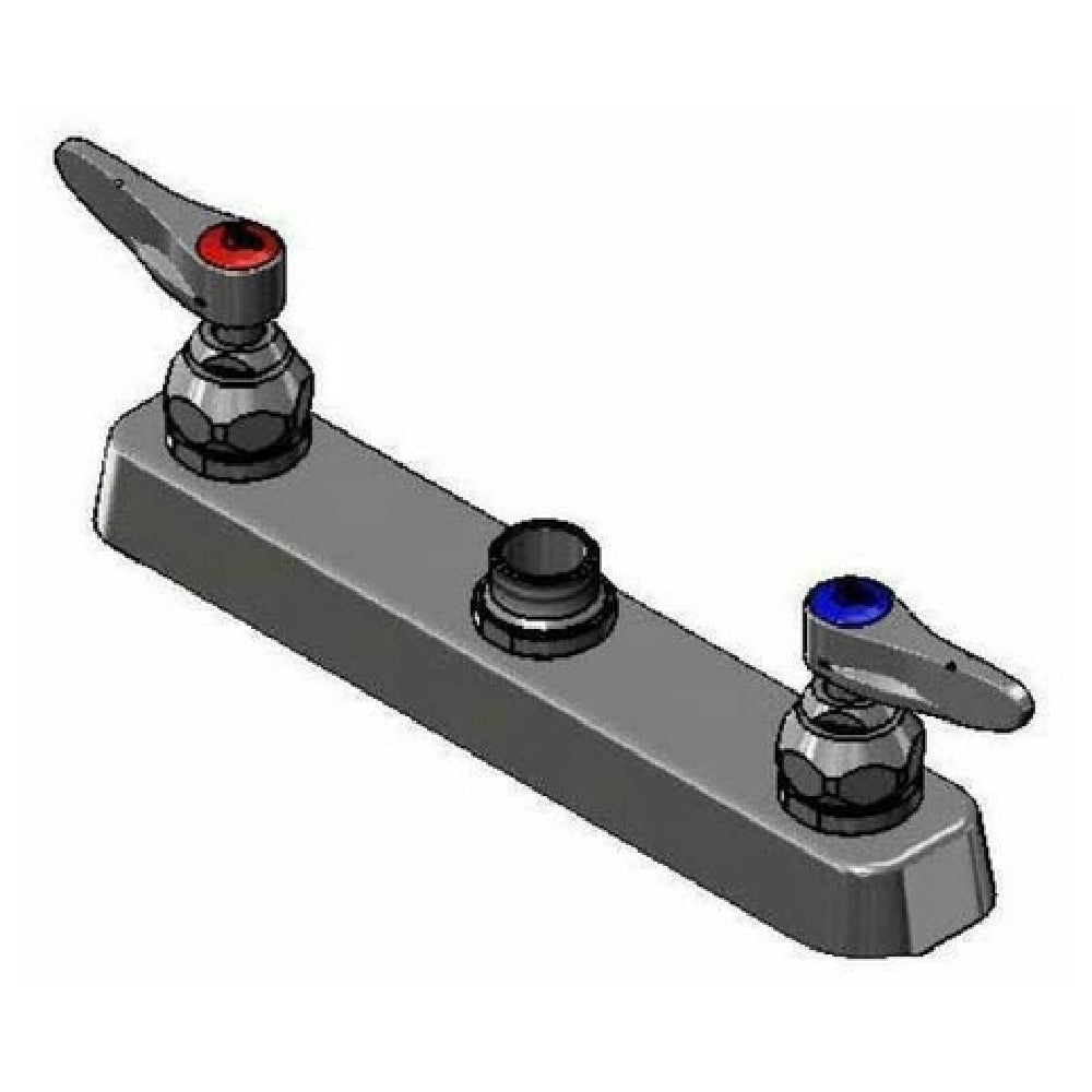 The T&S Brass B-5120-LN Workboard Mixing Faucet is a robust, deck-mounted fixture designed for commercial use with 8-inch centers. This model, adaptable to various settings, features a swivel outlet that accepts swing nozzles, providing versatility for different operational needs. Engineered with quarter-turn Eterna cartridges and equipped with spring checks, it ensures a reliable flow control system that minimizes wear and tear. The faucet is fitted with lever handles, prominently featuring color-coded indexes to facilitate easy identification and use, a beneficial feature for high-traffic environments. With 1/2-inch NPT male inlets, this faucet integrates seamlessly into existing plumbing setups. Its construction adheres to low lead regulations, making it a safe choice for environments where water quality is paramount. Furthermore, the B-5120-LN is ADA Compliant, providing accessibility features that align with industry standards. This faucet is a valuable asset in various marketplaces, including commercial kitchens and laboratories, where precise water delivery and reliability are critical. Its technical specifications and compliance with safety and accessibility standards make it a versatile and dependable component in professional settings.