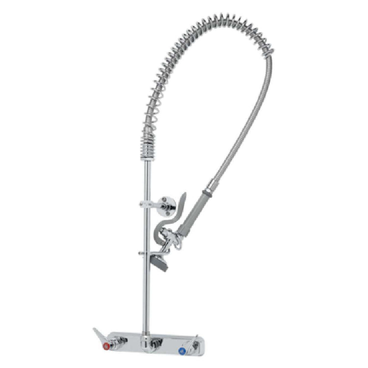 The T&S Brass B-5125-B EasyInstall Workboard Pre-Rinse Unit Wall Mount Mixing Faucet is engineered for efficiency and durability, ideal for commercial kitchens and foodservice operations. This wall-mounted faucet features an 8-inch center configuration, providing robust support and ease of installation. Equipped with a spring action gooseneck, it ensures flexible use and easy maneuverability, complemented by a 1.15 GPM spray valve (B-0107) for effective cleaning performance. An 18-inch riser connects to a 44-inch flexible stainless steel hose, offering extensive reach and versatility. The 6-inch wall bracket provides additional support, maintaining stability during use. Inlets are designed with 1/2-inch NPT male fittings, ensuring compatibility with standard plumbing connections. Lever handles facilitate ergonomic operation, while quarter-turn Eterna cartridges promise longevity and ease of maintenance. Low lead compliance ensures safety, meeting the 2019 DOE PRSV - Class II standards, making it suitable for environmentally conscious operations. This product is a valuable addition to any commercial kitchen, combining practical functionality with regulatory compliance for diverse market segments within the foodservice industry.