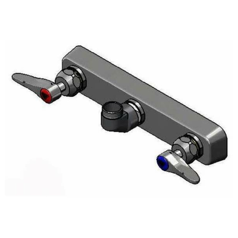 The T&S Brass B-5125-CR-LN Workboard Mixing Faucet is a wall-mounted fixture engineered with precision and practicality in mind, featuring 8-inch centers for optimal installation. This model is designed without a nozzle, yet its swivel outlet is adept at accepting swing nozzles, allowing for versatile water flow direction. It is equipped with quarter-turn Cerama cartridges that include check valves, ensuring smooth operation and preventing backflow. The faucet's lever handles are color-coded for easy identification and user convenience, enhancing its functional appeal. With 1/2-inch NPT male inlets, this faucet supports standard plumbing connections, making it a reliable choice for a wide range of applications. Engineered to be low lead, the T&S Brass B-5125-CR-LN meets rigorous safety standards, underscoring its commitment to health and environmental considerations. Furthermore, it is ADA Compliant, which speaks to its accessibility features and suitability for use in environments requiring ADA standard fixtures. This faucet is a practical addition to commercial kitchens, workstations, and other professional settings where durability and efficiency are paramount.