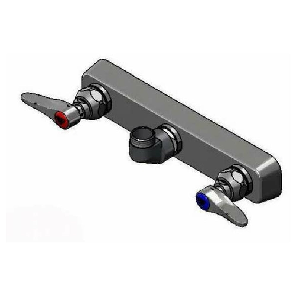 The T&S Brass B-5125-LN Workboard Mixing Faucet is a high-quality plumbing fixture designed for durability and versatility in various commercial settings. This wall-mounted faucet is engineered with 8-inch centers, making it suitable for a range of installations. A notable feature is its less nozzle design, which includes a swivel outlet that accommodates swing nozzles, providing flexibility in use. The faucet is equipped with quarter-turn Eterna cartridges with spring checks, ensuring smooth operation and preventing backflow. The lever handles are color-coded for easy identification and operation, enhancing user convenience. With 1/2-inch NPT male inlets, this faucet ensures a secure and reliable connection. It is constructed to meet low lead standards, promoting safety and compliance with health regulations. Additionally, the T&S Brass B-5125-LN is ADA compliant, reflecting its accessibility features for all users. Its robust construction and thoughtful design make it a valuable component for any commercial kitchen or workspace that demands efficiency and reliability in water dispensing systems.