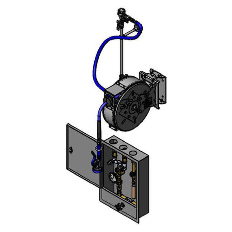 The T&S Brass B-7122-C01WS5 Hose Reel Control Unit is a wall-mount open stainless steel hose reel featuring a 3/8" x 30' heavy-duty non-marking hose, making it an optimal solution for various industrial and commercial settings. This unit is equipped with a ratcheting system and a high-flow spray gun with swivel, ensuring efficient water delivery and ease of use. The hose reel includes a multi-fit bracket and an adjustable hose bumper for versatile installation and enhanced durability. The stainless steel water control cabinet houses 1/2" union inlets and outlets, along with 1/2" check valves, which provide reliable and safe water flow management. Key components such as a loose key mixing valve with compression spindles, a bi-metallic thermometer, a dual check valve backflow preventer, a shut-off valve, and a water hammer arrestor, are meticulously integrated to support varied operational needs. Additionally, the hose reel connector kit comprises a 1/2" NPT elbow, an 18" riser, and a vacuum breaker, ensuring comprehensive installation and compliance with safety standards. This robust control unit is engineered to meet the demands of professional environments, combining functionality with precision engineering for maximum operational efficiency in diverse industry applications.