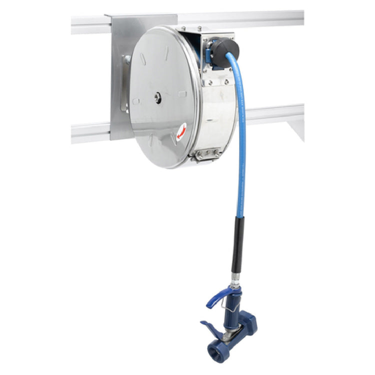 The T&S Brass B-7122-C05 Hose Reel is an expertly designed enclosed unit that features a 3/8" x 30' hose with a stainless steel front trigger water gun, providing a robust and efficient solution for various industrial and commercial applications. This hose reel incorporates a durable ratcheting system that ensures reliable hose control, allowing users to effortlessly extend and retract the hose as needed. Additionally, the adjustable hose bumper offers customizable hose length settings for tailored operational efficiency. The entire assembly is constructed from stainless steel, which not only enhances its durability but also ensures resistance to corrosion, making it suitable for environments where hygiene and longevity are paramount. This product is particularly valuable in industries such as food service, manufacturing, and automotive maintenance, where precise water delivery and equipment reliability are crucial. Its enclosed design keeps the hose protected and neatly stored, reducing wear and tangling for prolonged service life. The T&S Brass B-7122-C05 Hose Reel is a testament to superior engineering, offering a seamless blend of functionality and resilience that meets the demanding needs of professional settings. This key feature set positions it as a versatile and dependable addition to any facility where water management is a critical component of daily operations.