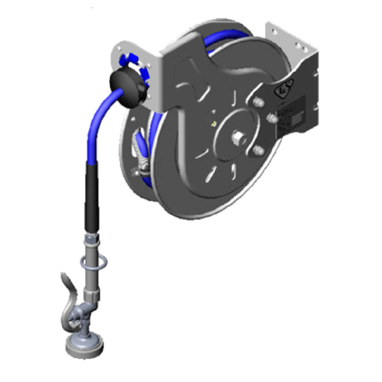 The T&S Brass B-7132-01M Hose Reel is a specialized tool designed explicitly for industries requiring efficient water distribution and control. This open hose reel is equipped with a 3/8" diameter hose extending to 35 feet, providing substantial reach for various applications. A notable feature is its 1.15 GPM (gallons per minute) spray valve, model B-0107, which ensures precise and controlled water flow. The reel incorporates a ratcheting system that facilitates smooth operation and ease of use, allowing users to lock the hose in place at any desired length. Additionally, the adjustable hose bumper enhances user convenience by allowing customization of the hose's stopping point. Constructed from stainless steel, this hose reel is built for durability and longevity, making it suitable for demanding environments. Its robust design caters to multiple industry segments, including food service, sanitation, and maintenance, where reliability and performance are crucial. The T&S Brass B-7132-01M Hose Reel stands out for its combination of durable materials, thoughtful engineering, and practical features, making it a valuable asset for professionals seeking efficient water management solutions.