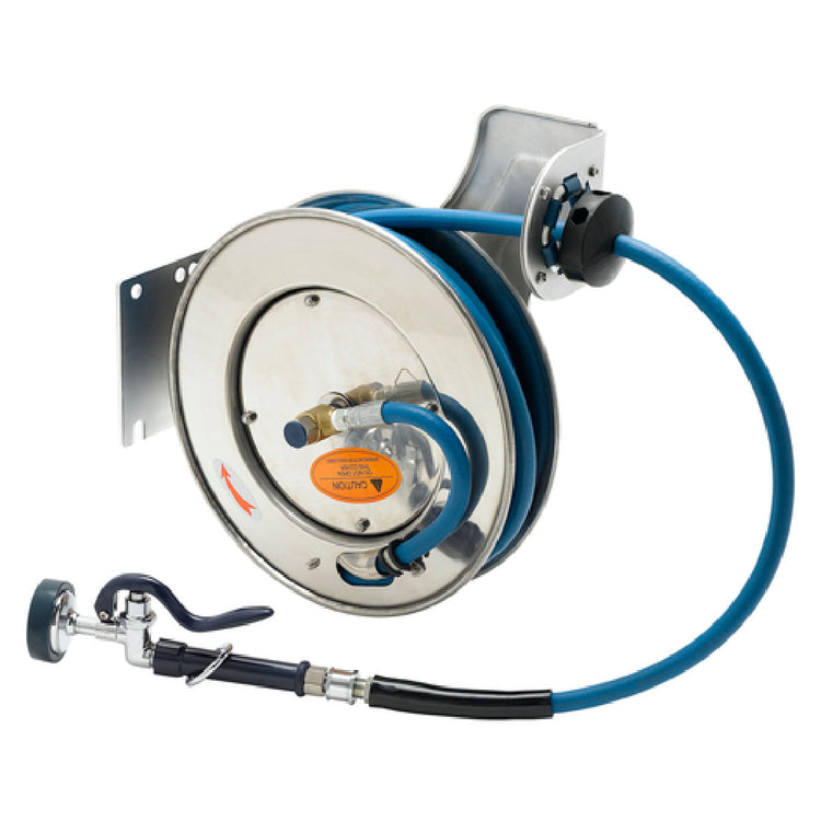 The T&S Brass B-7143-01 Hose Reel System is a robust open system featuring a 1/2" x 50' hose complete with a high flow spray valve, making it ideal for various industrial and commercial applications requiring efficient water flow and management. This system is equipped with a ratcheting mechanism that allows for easy control and adjustment of the hose length, ensuring precision and flexibility in usage. Additionally, an adjustable hose bumper is included, which enhances usability by preventing over-extension and ensuring the hose is stored safely when not in use. The entire assembly is crafted from stainless steel, providing durability and resistance to corrosion, making it suitable for demanding environments. This hose reel system is engineered to meet the needs of different market segments, such as foodservice, hospitality, and sanitation industries, where high flow and reliability are paramount. By combining technical excellence with practical design, the T&S Brass B-7143-01 Hose Reel System offers a dependable solution for professionals who require performance and longevity in their equipment.
