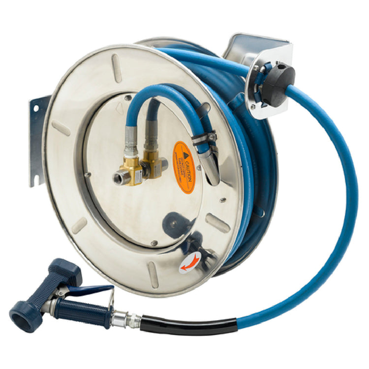 The T&S Brass B-7143-03 Hose Reel System is an expertly designed tool engineered for efficiency and durability in various industrial and commercial settings. Featuring an open 1/2" x 50' hose, this system ensures ample reach and flexibility for diverse applications, making it indispensable for sectors ranging from agriculture to manufacturing. The stainless steel rear trigger spray valve with a 7/16" orifice is tailored for precise control and reliability, enhancing operational efficiency. This hose reel system incorporates a robust ratcheting system, allowing for seamless hose management and minimizing workplace clutter. Additionally, its adjustable hose bumper aids in achieving the desired hose length effortlessly, reducing user strain and increasing productivity. Constructed with premium stainless steel, the T&S Brass B-7143-03 guarantees longevity and resistance to corrosion, making it a sustainable choice for harsh environments. The thoughtful engineering behind this hose reel system not only elevates performance but also ensures that it meets the demanding needs of various industries, providing a unique blend of functionality and resilience. Whether employed in a car wash, food processing plant, or any other high-demand environment, this product stands as a testament to quality engineering and design excellence.