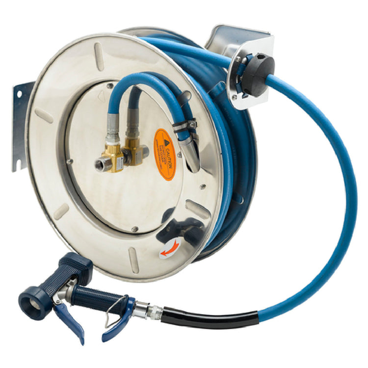 The T&S Brass B-7143-07 Hose Reel System is a comprehensive solution designed for efficiency and durability in demanding environments. This open hose reel system features a 1/2" x 50' hose, making it suitable for a variety of industrial and commercial applications. The key component, a stainless steel front trigger spray valve, incorporates a 9/16" orifice, ensuring precise and powerful water output for tasks requiring focused spraying. The inclusion of a ratcheting system enhances the user experience by allowing for smooth and controlled hose retraction. Additionally, the adjustable hose bumper provides flexibility in setting the desired length of the hose, catering to specific work requirements. Constructed with stainless steel, the system is built to withstand harsh conditions and offers longevity, minimizing downtime and maintenance costs. This hose reel system is an optimal choice for industries ranging from food service to manufacturing, where reliable water delivery and ease of use are paramount. Its durable construction and functional design make it a standout in its category, addressing the needs of professionals looking for efficiency and reliability in their operational tools.