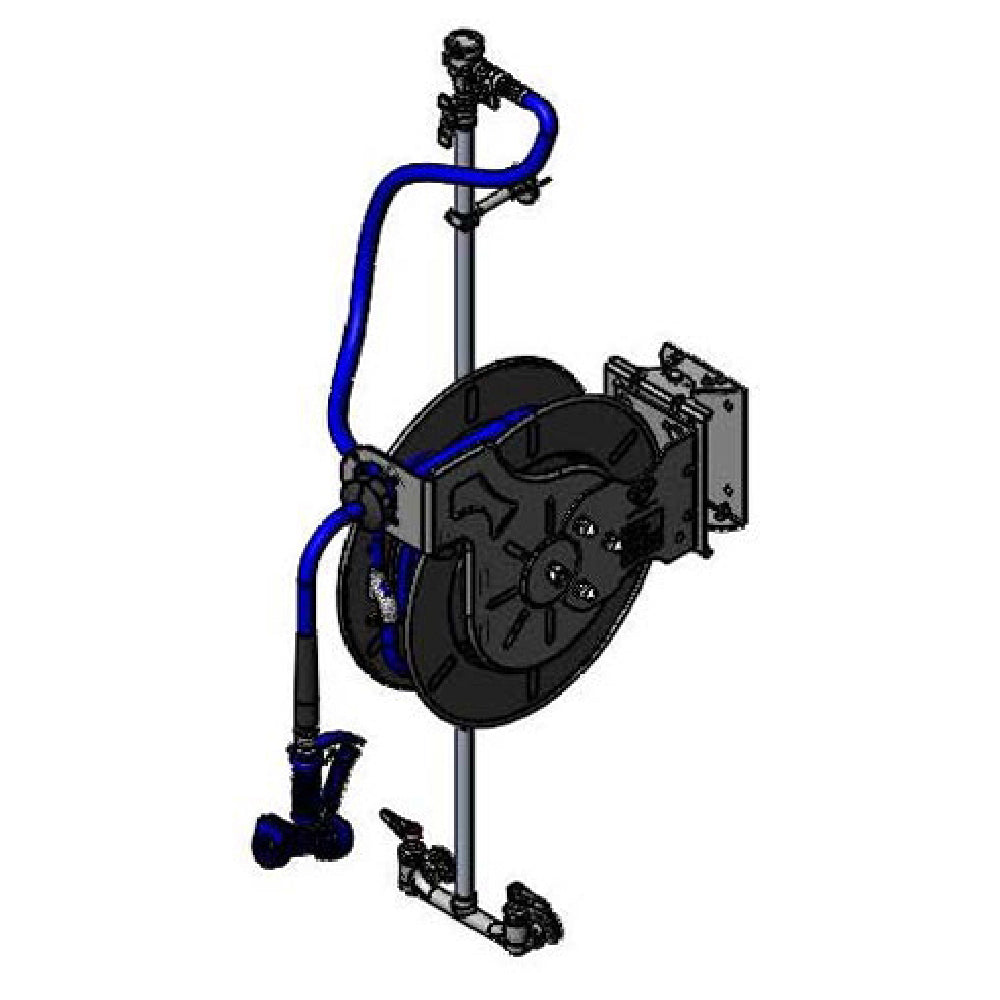 The T&S Brass B-7143-U05WS1C Hose Reel System is an industrial-grade 8-inch wall mount mixing faucet. It features an open stainless steel hose reel designed for heavy-duty usage, complete with a 1/2-inch by 50-foot non-marking hose. Integral to this system is a high flow stainless steel front trigger water gun with a swivel, providing ease of use and durability. The ratcheting system, multi-fit bracket, and adjustable hose bumper make this hose reel system versatile for various installation and operational needs. Enhanced connectivity is facilitated by a 36-inch flexible water hose connector with a stainless steel quick disconnect. The wall-mounted polished chrome-plated brass mixing faucet is engineered with 8-inch centers and includes compression cartridges with spring checks and lever handles for precise control. Further enhancing its functionality is a 32-inch riser, control valve, and EasyInstall wall swing bracket. This product is designed with 1/2-inch NPT female inlets for seamless integration into existing systems. The combination of high-quality materials and thoughtful design makes the T&S Brass B-7143-U05WS1C Hose Reel System an ideal solution for industries requiring reliable and efficient water distribution systems.