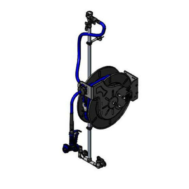 The T&S Brass B-7143-U05XS1E 1/2" Hose Reel System - 8" Base Faucet Control Valve Risers is a comprehensive solution designed for efficient fluid management in industrial and commercial settings. This expertly engineered system incorporates an 8-inch base faucet, providing a sturdy foundation for seamless operation. It includes control valve risers for precise flow regulation, ensuring optimal performance in demanding environments. The system is equipped with VB (vacuum breaker) technology, enhancing safety by preventing backflow contamination. A heavy-duty HW (hot water) hose is integrated, allowing for high-temperature fluid handling with ease. The inclusion of a durable reel facilitates organized storage and quick access to the hose, minimizing downtime and increasing productivity. The MV gun, part of this system, ensures accurate direct application of fluids, making it a versatile tool for various industries. With a 1/2-inch hose diameter, this system is tailored for robust fluid transfer applications, marking its significance in sectors requiring reliable and efficient water and fluid management solutions. The T&S Brass B-7143-U05XS1E is engineered to combine functionality and durability, offering a reliable choice for businesses seeking efficiency and longevity in their equipment.