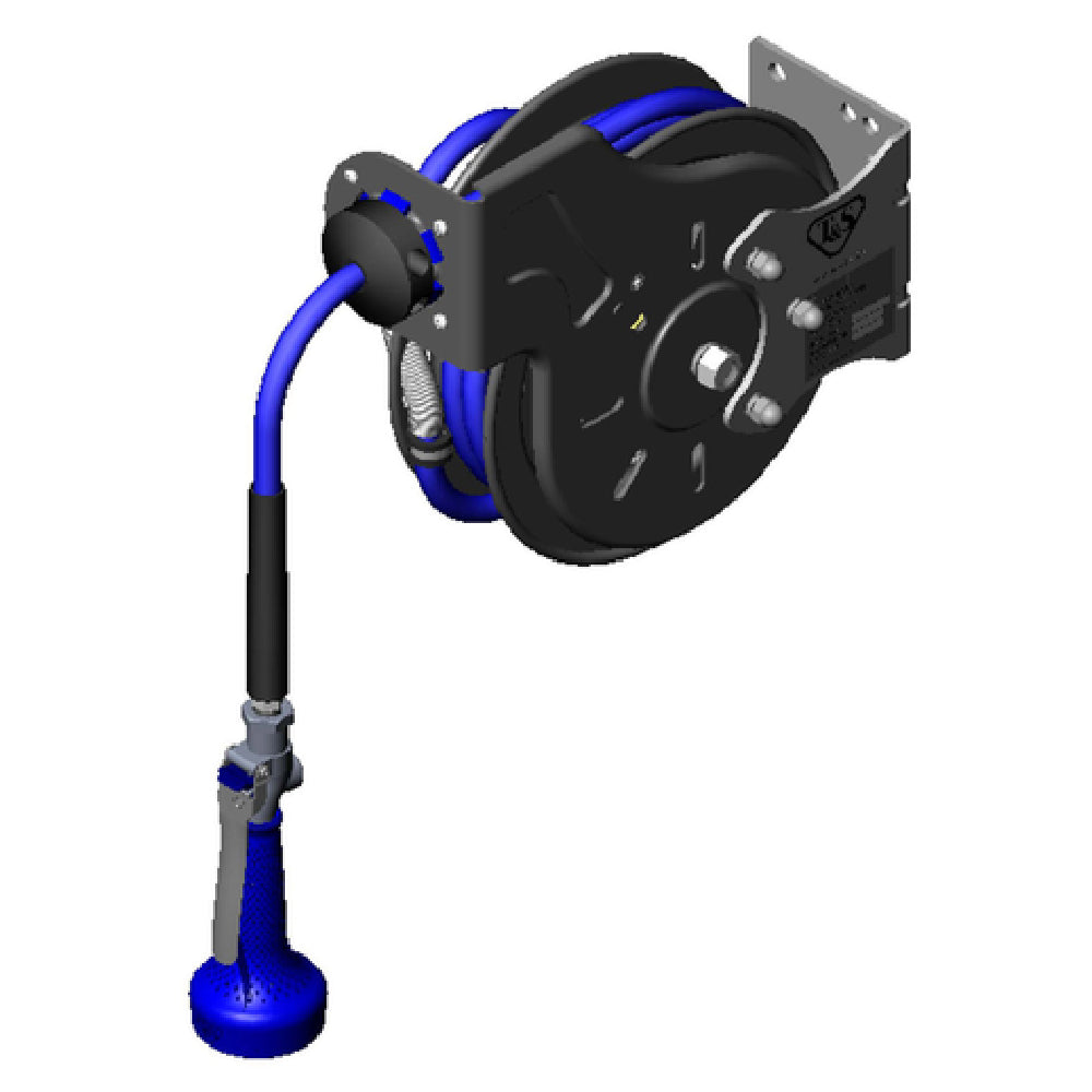 The T&S Brass B-7212-08H Hose Reel System is an open configuration designed to deliver efficiency and reliability, equipped with a 3/8" x 15' hose that ensures ample reach and flexibility in various operational environments. This system features a high-flow JetSpray valve, which is engineered for optimal water distribution and performance. It incorporates a ratcheting system that allows for smooth hose retraction and extension, providing convenience and reducing manual effort for users. The adjustable hose bumper is another vital component, allowing precise control over hose length and preventing excessive unraveling. The epoxy-coated steel construction of the hose reel ensures durability and protection against environmental wear, making it suitable for demanding industrial and commercial applications. This product is particularly beneficial for sectors that require robust water delivery systems, including food service, hospitality, and maintenance industries, due to its versatile functionality and advanced engineering. The T&S Brass B-7212-08H is a testament to quality and innovation, providing a reliable solution for businesses that demand both performance and longevity from their equipment.