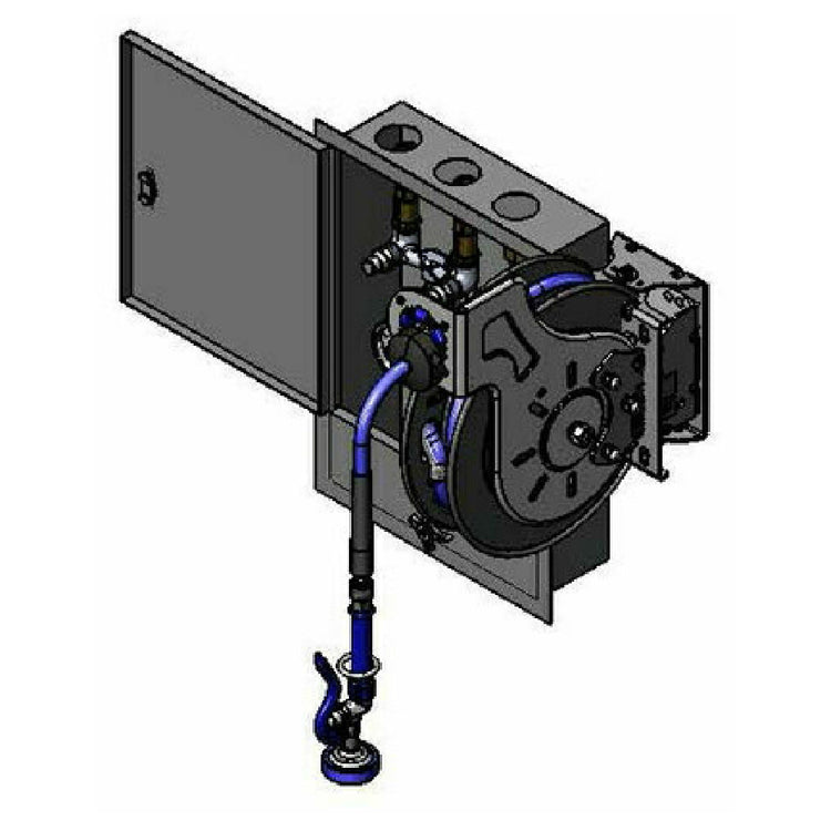 The T&S Brass B-7232-U01WS5 Hose Reel Assembly Open Control Unit is a meticulously engineered solution tailored for optimal water management in various industrial settings. Encased within a robust stainless steel water control cabinet, this unit ensures durability and reliability. It features 1/2" union inlets and outlets, along with 1/2" check valves, enhancing its efficiency and safety. The loose key mixing valve is equipped with compression spindles, providing precise control over water flow. A bi-metallic thermometer is included for accurate water temperature monitoring, while a dual check valve backflow preventer adds an essential layer of protection against water contamination. The assembly also incorporates a shut-off valve and a water hammer arrestor, ensuring smooth operation under high-pressure conditions. The hose reel connector kit comes with a 1/2" NPT elbow, an 18" riser, and a vacuum breaker, facilitating seamless integration into existing systems. An open coated hose reel with a 3/8" x 35' heavy-duty non-marking hose and a ratcheting system is designed for ease of use, complete with a high flow spray valve with swivel for enhanced flexibility. A multi-fit bracket, stainless steel wall mount swing bracket, and adjustable hose bumper offer versatile installation options. Certified to ASSE 1024, ASSE 1010, and ASSE 1056, this unit meets rigorous safety standards, making it an invaluable asset for diverse operational needs.