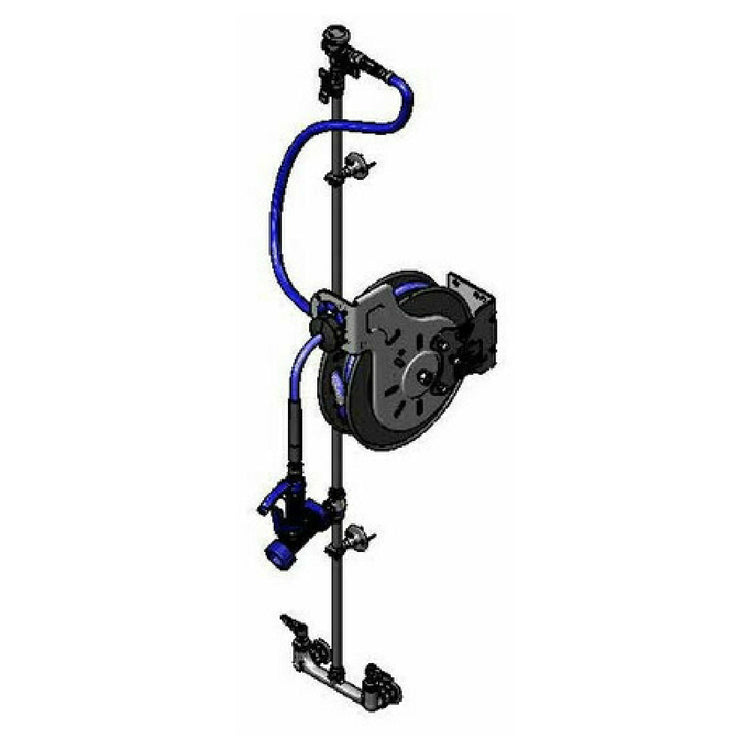 The T&S Brass B-7232-U05XS1E Hose Reel Assembly Open - 3/8" X 35 Ft. Hose With High Flow Spray Valve With Swivel is a premium solution finely tuned for demanding commercial environments requiring flexibility and efficiency. This assembly features an open 3/8" x 35 ft. hose equipped with a high flow spray valve and swivel, enhancing maneuverability and ease of use. It incorporates an 8" wall mount mixing faucet with adjustable centers, complemented by quarter-turn Eterna compression cartridges with spring checks to ensure reliable operation and longevity. The unit's lever handles are designed with color-coded indexes for intuitive usability. A continuous pressure vacuum breaker is included to maintain system integrity under pressure fluctuations. The assembly is further supported by a 36" flexible water hose connector with a stainless steel quick disconnect. A ratcheting system, multi-fit bracket, and adjustable hose bumper add to its adaptability. For secure installation, the package includes (2) 2-3/8" wall brackets, and EasyInstall 16" & 40" risers. Constructed with an epoxy-coated steel hose reel and a polished chrome-plated brass faucet body, its robust design is complemented by 1/2" NPT female inlets, making it a durable and versatile choice for various industrial applications.