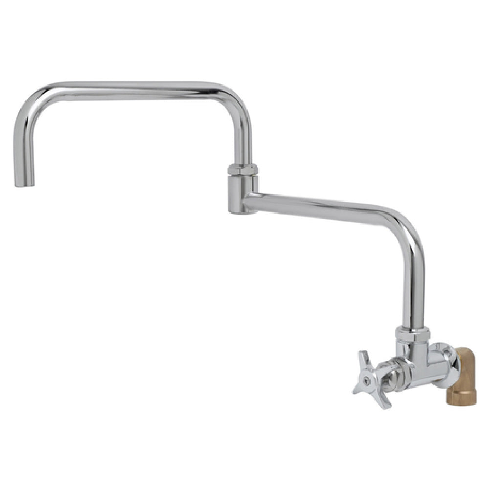 The T&S Brass BF-0299-18DJ Big-Flo Faucet Wall Mount 18" Swivel Double Joint Nozzle is an innovative plumbing solution designed for versatility and durability in commercial and industrial settings. This faucet features an 18-inch swivel double joint nozzle, providing exceptional reach and maneuverability, ideal for tasks requiring extensive coverage in large sinks or washing areas. The wall mount design ensures stability and space efficiency, making it suitable for environments where countertop space is at a premium. Equipped with a 4-arm handle, it allows for easy and precise control of water flow, enhancing user convenience. The 3/4" NPT street elbow facilitates straightforward installation, integrating seamlessly into existing plumbing systems. Additionally, the faucet is ADA compliant, meeting accessibility standards and ensuring ease of use for individuals with disabilities. The T&S Brass BF-0299-18DJ is particularly suited for industries such as hospitality, healthcare, and food service, where functionality, compliance, and reliability are paramount. Its robust construction and thoughtful design make it a valuable asset for high-demand environments, delivering consistent performance and meeting diverse operational needs with efficiency.