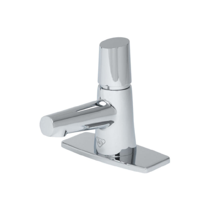 The T&S Brass BP-0723-4DP LakeCrest Aesthetic Metering Lavatory Faucet - Polished Chrome is a fusion of style and functionality, ideal for a range of commercial lavatory settings. Its polished chrome finish not only enhances its aesthetic appeal but also ensures durability and resistance to corrosion. Designed with precision, this faucet features a metering mechanism that delivers controlled water flow, promoting water conservation without compromising on performance. The inclusion of a deck plate enables seamless installation, making it suitable for various sink configurations. As a product of T&S Brass, a trusted name in plumbing solutions, the faucet assures reliability and quality. This faucet is an excellent choice for businesses focusing on sustainability and efficiency while maintaining a sleek and modern restroom appearance. With its robust construction and sophisticated design, the T&S Brass BP-0723-4DP faucet supports high-traffic environments, offering long-lasting service and minimal maintenance. Its unique value lies in balancing cost-efficiency with high standards of hygiene and user experience, catering to markets that prioritize eco-friendly solutions and modern design aesthetics in washroom fixtures.