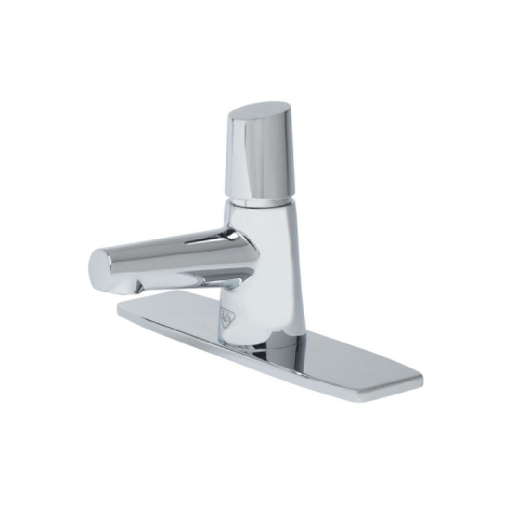 The T-S Brass BP-0723-8DP LakeCrest Aesthetic Metering Lavatory Faucet - Polished Chrome is a sophisticated and practical choice for various commercial and residential environments. This faucet is constructed with a polished chrome finish, providing a sleek and modern aesthetic that enhances any bathroom decor. The inclusion of a deck plate allows for seamless integration onto the lavatory surface, ensuring a clean and professional installation. As a metering faucet, it is designed to deliver a specific amount of water per activation, promoting water conservation and efficient usage, a crucial feature for facilities focused on sustainability and cost-effectiveness. T-S Brass, a brand known for quality and durability, ensures that this model offers not only aesthetic appeal but also reliable performance. The faucet is ideal for public restrooms, healthcare facilities, educational institutions, and other high-traffic areas where water efficiency and hygiene are paramount. With its combination of elegant design, environmental consideration, and robust construction, the T-S Brass BP-0723-8DP LakeCrest Aesthetic Metering Lavatory Faucet stands out as a versatile and high-value plumbing fixture for various market segments within the industry.