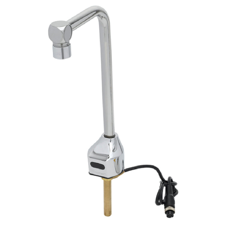 The T&S Brass EC-1210-10 ChekPoint™ Electronic Glass Filler is a state-of-the-art deck mount fixture, expertly crafted for high-demand environments such as restaurants, cafes, and hospitality venues. This product features a rigid high-arc design with a height of 10 inches, providing ample clearance for filling various glass sizes. Manufactured from chrome-plated brass, it ensures durability and a sleek appearance. The single-hole design simplifies installation, while the AC/DC control module enhances versatility in power supply options. This glass filler incorporates internal flow control setting switches, allowing precise water flow regulation. An 18-inch long flex stainless steel supply hose offers robust connectivity and ease of installation. It is equipped with a vandal-resistant laminar device, further protected by an anti-microbial coating, promoting hygiene and safety. The unit delivers a water flow rate of 1.5 gallons per minute (GPM) and adheres to low lead requirements, making it a responsible choice for health-conscious establishments. With certifications from cCSAus and cULus, it meets stringent safety standards, while ADA compliance ensures accessibility for all users. The T&S Brass EC-1210-10 is an exemplary choice for industry professionals seeking reliability, efficiency, and compliance with health and safety regulations.