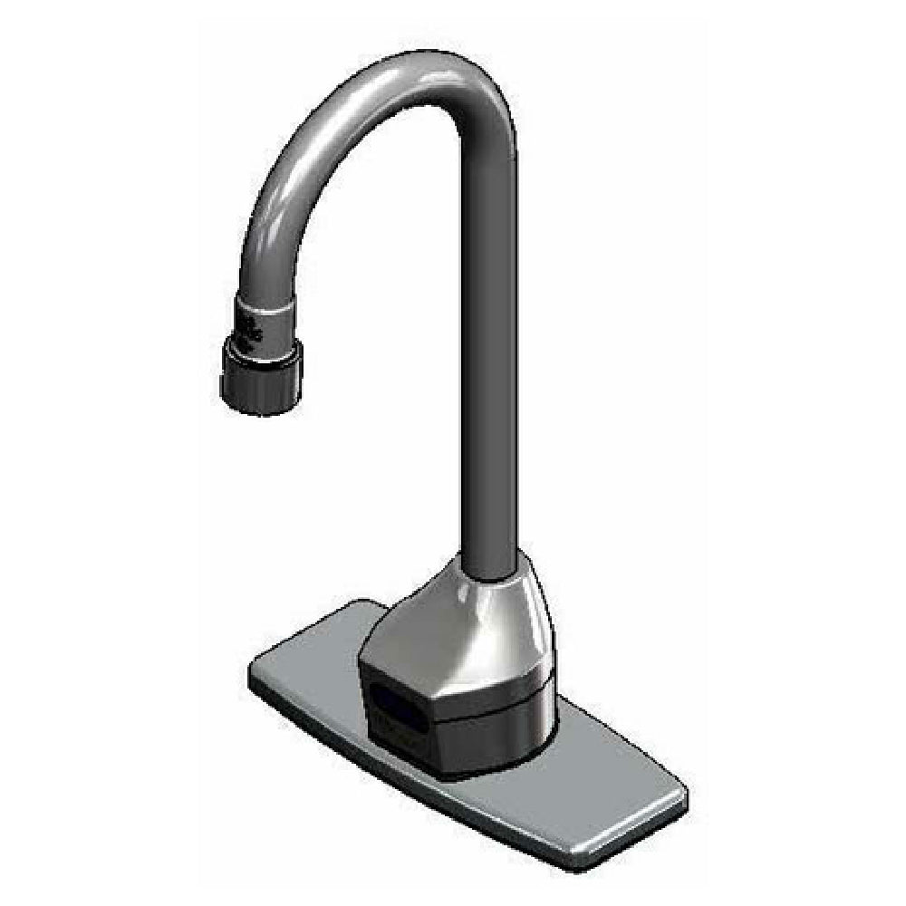 The T&S Brass EC-3100-4DP-HG ChekPoint™ Electronic Faucet is a sophisticated single-hole, deck-mount fixture designed for both efficiency and durability. With a 4-1/8" rigid gooseneck and a 4" deck plate, this faucet is crafted from chrome-plated brass, ensuring a robust and low-lead compliant construction. It features a 2.2 GPM vandal-resistant aerator, ideal for high-traffic areas where durability and performance are paramount. The faucet is powered by a versatile AC/DC control module and includes a hydro-generator power supply, with an optional 100-240 VAC adapter for varied power sources. Furthermore, it can be powered by four "AA" batteries, although these are not included. Engineered with a mixing tee, the faucet facilitates precise temperature control, making it a versatile choice for various industry segments requiring stringent water management. Its compliance with cCSAus, cULus, and ADA standards underscores its commitment to safety and accessibility, enhancing its appeal for commercial and institutional markets. The T&S Brass EC-3100-4DP-HG ChekPoint™ Electronic Faucet represents a blend of innovation and functionality, tailored to meet the diverse needs of modern facilities while upholding exceptional standards of quality and reliability.