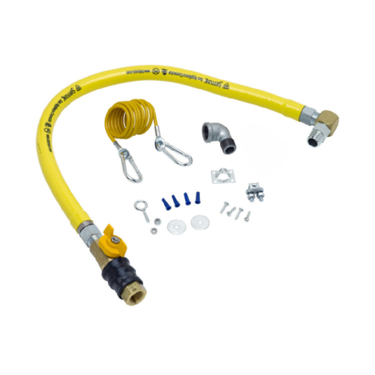 T&S Brass, HG-4C-36G-SEL, Gas Appliance Connector Hose, 36", coated, with 1/2" NPT male connection, quick disconnect valve, (1) swivel fitting, (2) street elbows and restraining cable kit. Certified to ANSI Z21.69/CSA 6.16 and NSF 2.