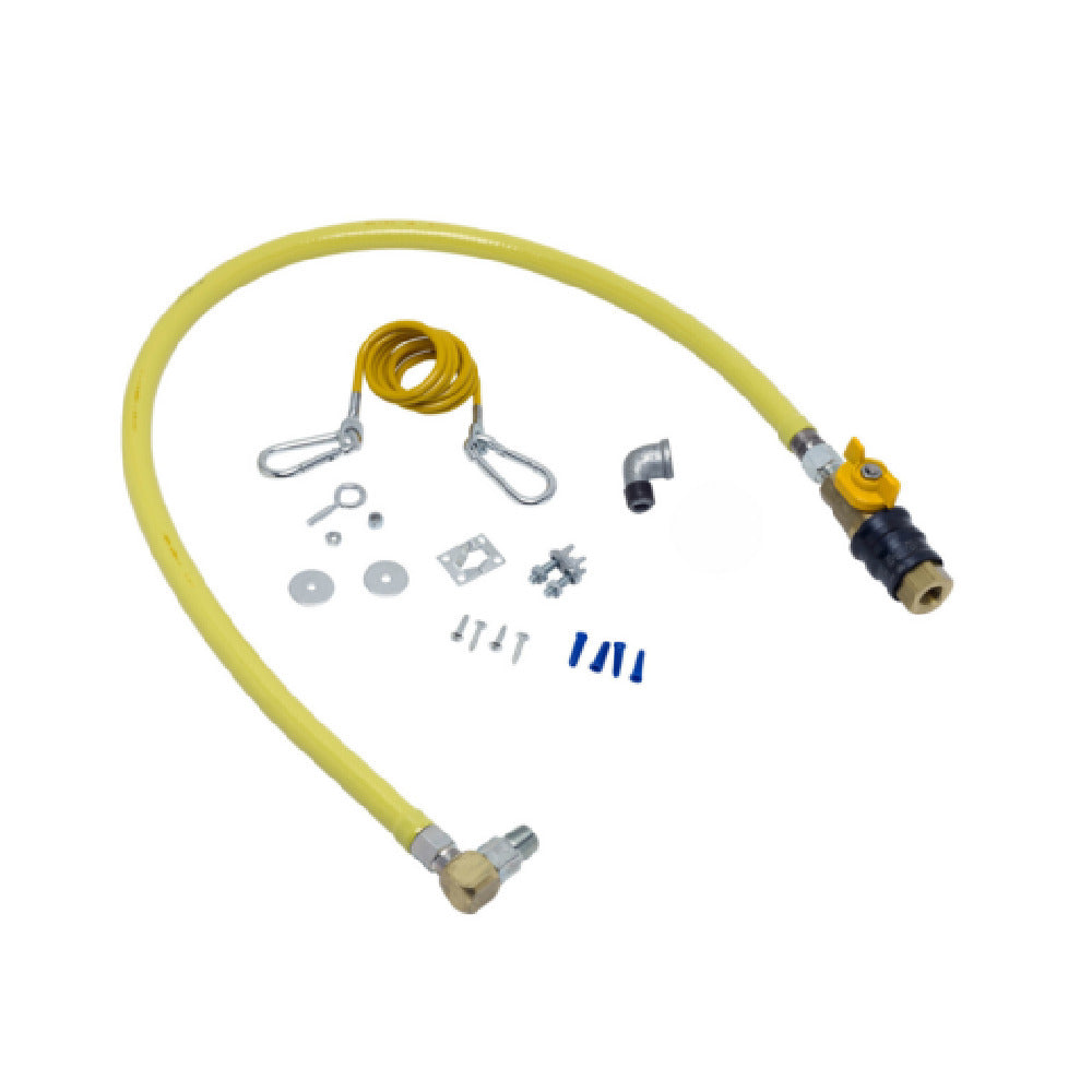 T&S Brass, HG-4C-48G-SEL, Gas Appliance Connector Hose, 48", coated, with 1/2" NPT male connection, quick disconnect valve, (1) swivel fitting, (2) street elbows and restraining cable kit. Certified to ANSI Z21.69/CSA 6.16 and NSF 2.