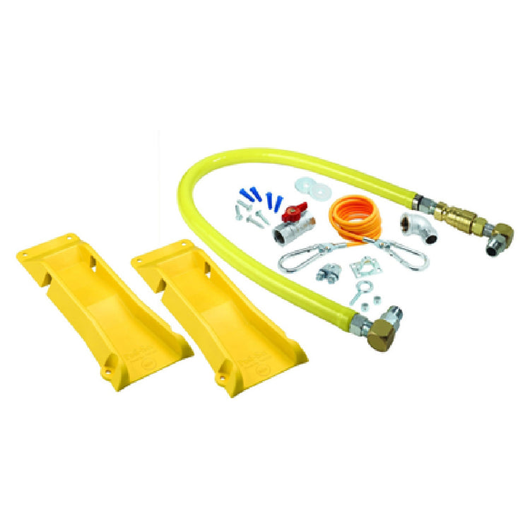 The T&S Brass HG-4C-48SK-PS Safe-T-Link Gas Connector Kit is a high-performance solution designed for safe and efficient gas connectivity. With a 1/2" connection and a substantial 48" hose, this kit is suitable for various applications within commercial kitchen environments. The hose features stainless steel braiding with an extruded coating, enhancing durability and resistance to wear, making it a reliable choice for demanding settings. This connector kit integrates a Quick-Disconnect feature for easy installation and maintenance, alongside two Swivelink fittings that provide flexibility and ease of movement, accommodating diverse kitchen layouts. The inclusion of a 90° elbow and ball valve further enhances its adaptability and control over gas flow. Safety is prioritized with an adjustable restraining cable ranging from 3' to 5', incorporating the Posi-Set feature for secure installations. The kit supports a minimum flow capacity of 70,000 BTU/hr, ensuring robust performance for high-demand appliances. The T&S Brass HG-4C-48SK-PS stands out in its segment with its blend of safety, flexibility, and efficient gas flow management, making it an essential component for ensuring the smooth operation of gas-powered equipment in professional kitchens.