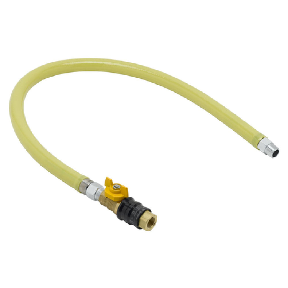The T&S Brass HG-4D-36G Safe-T-Link Gas Connector Hose is engineered for high-performance and safety in commercial kitchens. This gas connector hose features a 3/4-inch connection and extends to a 36-inch hose length, making it a versatile choice for various kitchen setups. Its construction includes a stainless steel braiding with an extruded coating, ensuring durability and resistance to environmental wear. A standout feature is the Safe-T-Guard Quick-Disconnect valve (QDV), allowing for secure and efficient disconnection when needed. Additionally, the hose includes one 90° elbow and one street "EL" for enhanced flexibility in installation. With a minimum flow capacity of 220,000 BTU per hour, this gas connector hose supports high-demand cooking environments, ensuring consistent gas flow for optimal appliance performance. The T&S Brass HG-4D-36G is designed to meet the rigorous demands of the foodservice industry, providing both reliability and safety for chefs and kitchen operators. Its thoughtful design and robust technical specifications make it a crucial component for any professional kitchen seeking efficiency and safety in their gas appliance connections.