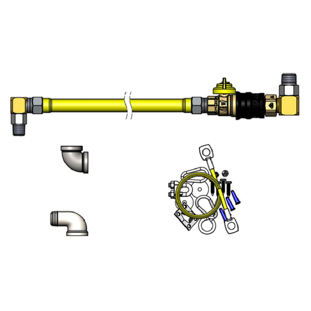 The T&S Brass HG-4D-48GS-K Safe-T-Link Gas Connector Hose is a high-performance solution for secure and efficient gas connectivity in demanding environments. Featuring a 3/4" connection and a 48" hose length, this product is designed to meet various industry needs. Its robust construction includes stainless steel braiding with an extruded coating, ensuring durability and resistance to wear and tear. The Safe-T-Guard Quick-Disconnect valve (QDV) provides an additional layer of safety and convenience, allowing for prompt disconnection when necessary. The inclusion of Swivelink fittings enhances flexibility and ease of installation, accommodating a range of setups. Additionally, the hose's design incorporates both a 90-degree elbow and a street 'EL' hose for versatile application. A restraining cable kit further adds to the security and reliability of this product. With a minimum flow capacity of 180,000 BTU/hr, the T&S Brass HG-4D-48GS-K is engineered to supply ample energy for various gas-powered systems. This gas connector hose is suited for use in a variety of market segments, including commercial kitchens and industrial settings, where safety, durability, and performance are paramount. Its comprehensive set of features ensures it is a reliable asset for any operation requiring gas connectivity.