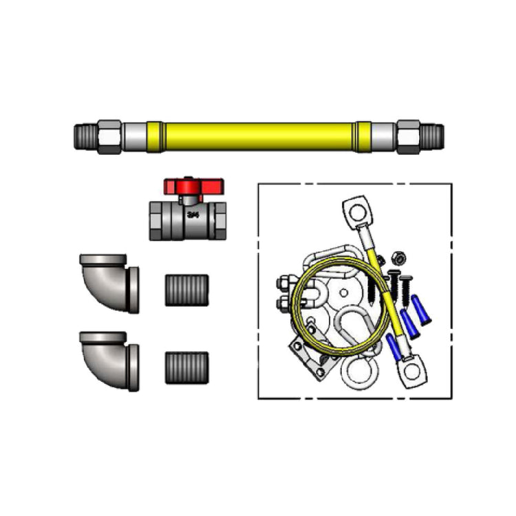The T&S Brass HG-4E-36SK-FF Safe-T-Link Gas Connector Hose is engineered for high efficiency and reliability, making it a vital component in commercial kitchens and industrial settings. Featuring a 1-inch connection and a 36-inch hose, this product is designed with stainless steel braiding and an extruded coating, ensuring durability and resistance to wear. The gas connector hose comes equipped with a Quick-Disconnect feature and two Swivelink fittings, allowing for easy installation and flexible mobility. Its cable kit, ball valve, gas elbows, and nipples contribute to its comprehensive functionality, making it suitable for various gas connection needs. With a minimum flow capacity of 380,000 BTU/hr, it supports high-demand environments effectively. The T&S Brass HG-4E-36SK-FF is an ideal choice for professionals seeking robust and secure gas connection solutions, offering a blend of advanced engineering and practical design tailored for versatile applications. Whether in a bustling restaurant or an industrial facility, this gas connector hose delivers exceptional performance and safety, ensuring uninterrupted service and peace of mind.