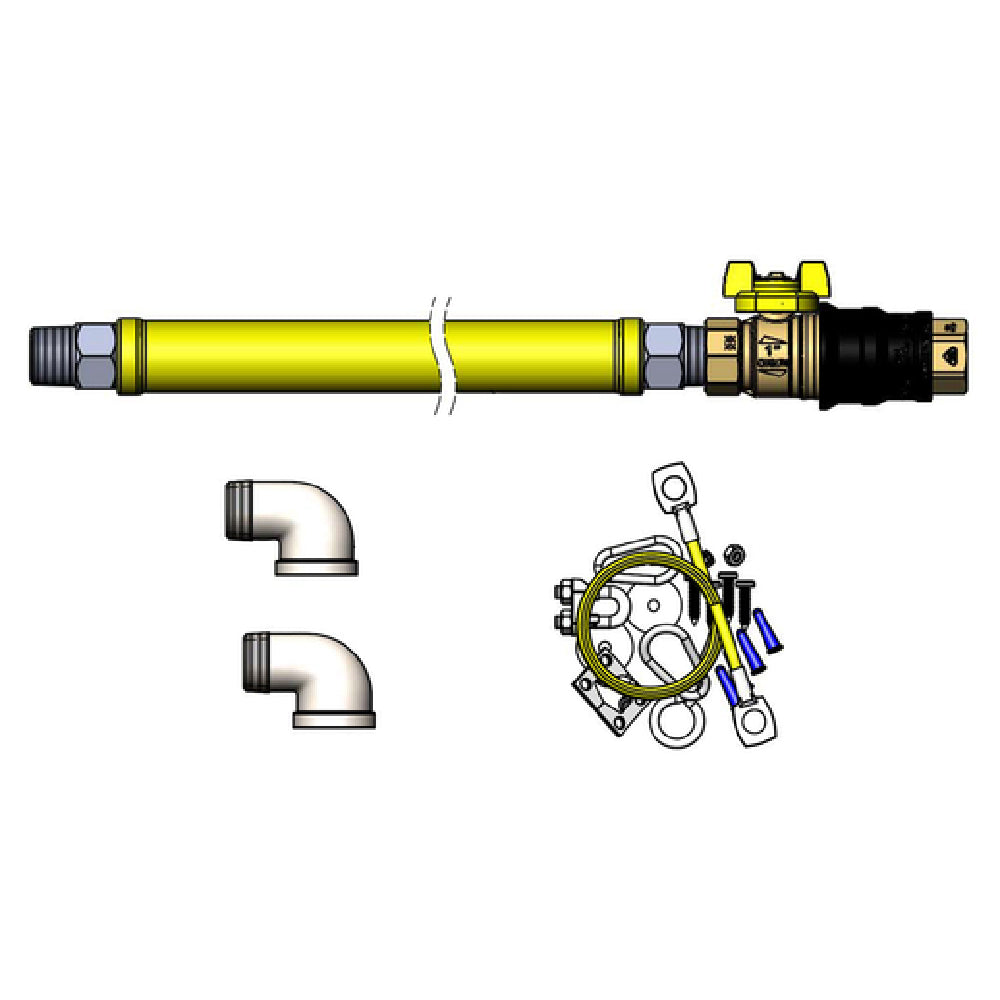 The T&S Brass HG-4E-48G-K Safe-T-Link Gas Connector Hose is a high-performance component designed for secure and efficient gas connections. Featuring a 1-inch connection and an extended 48-inch hose, it is suitable for a variety of industrial and commercial applications. This gas connector hose is reinforced with stainless steel braiding and an extruded coating, ensuring durability and resistance to wear and tear. It includes the Safe-T-Guard Quick-Disconnect valve, enhancing safety by allowing for swift and secure disconnection. Additionally, the package contains two street elbows and a restraining cable kit, providing versatility and stability during installation. With a minimum flow capacity of 335,000 BTU per hour, this gas connector hose supports high-demand operations, making it ideal for establishments such as restaurants and food service facilities that require reliable and robust gas flow solutions. The T&S Brass HG-4E-48G-K is engineered to meet the rigorous standards of safety and efficiency, making it a valuable asset for professionals seeking dependable gas connection solutions.